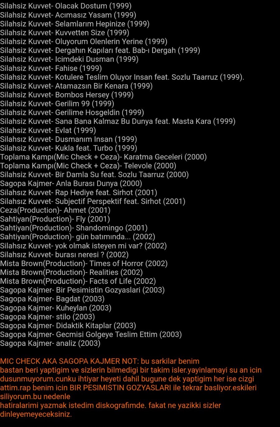 Gerilim 99 daki şarkilari full bu listeye koymus zaten Sago o albümu yayinlamamis olarak kabul ediyor , bpg basta 11 12 şarki falan olacakti ondan en sonda bpg trackleri var. Mista brown 2003 de ep çıkaracaktı ( funky c gibi) o şarkılar o ep ye ait büyük ihtimal, ama çıkmadı.